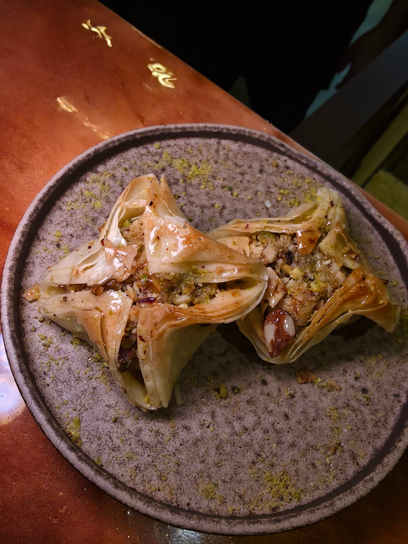 Finas capas de masa filo humedecidas en mantequilla y relleno de pistacho, canela bañados en almíbar.