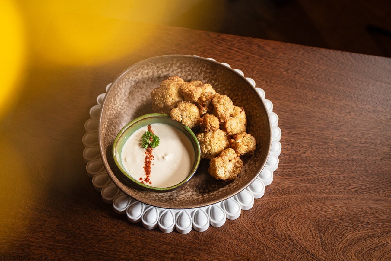 Coliflor frita dorada al punto perfecto, acompañada con salsa cremosa de tahini.