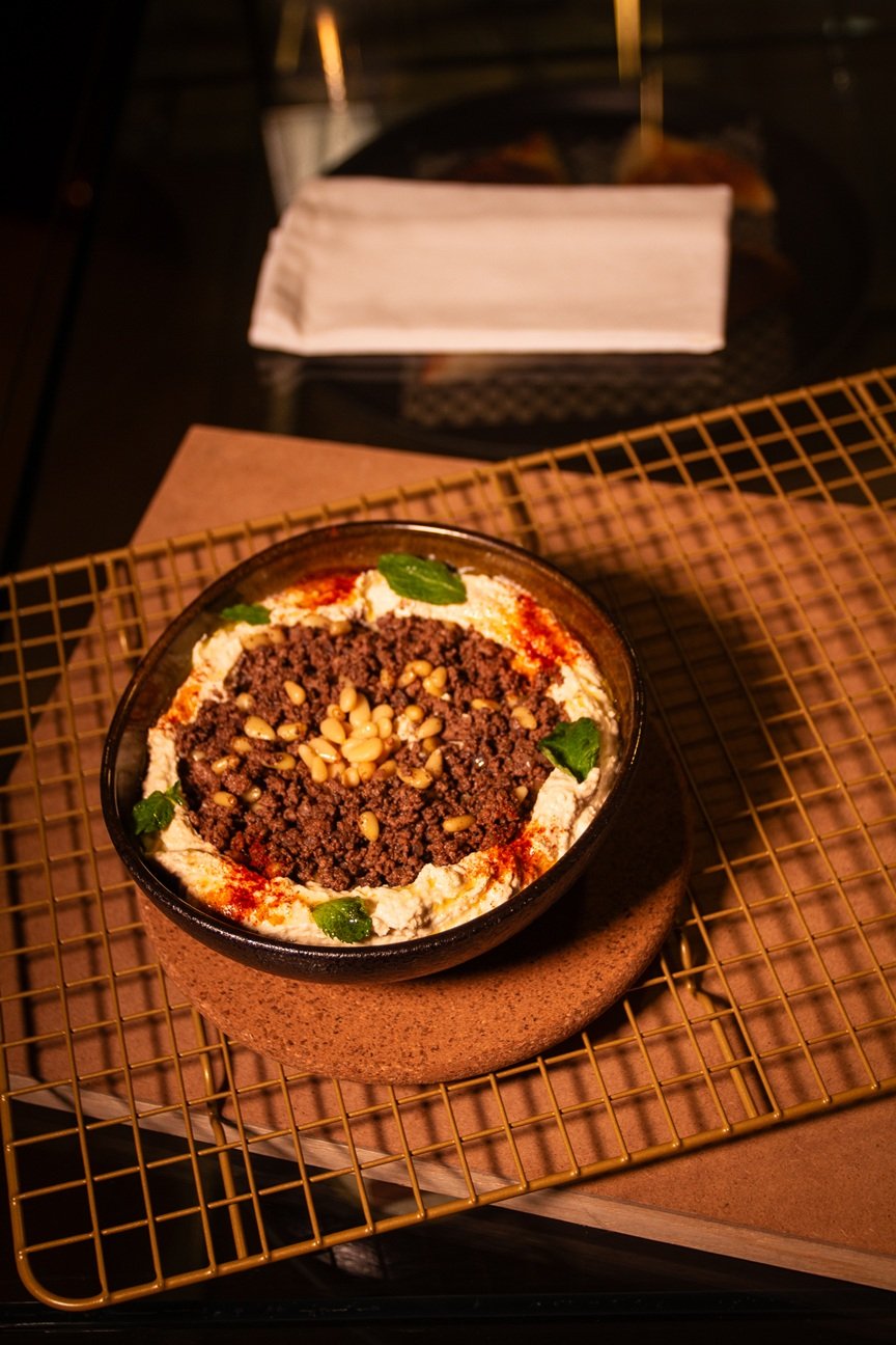 Crema de garbanzos con tahini , aceite V.E y paprika combinado con carne molida.