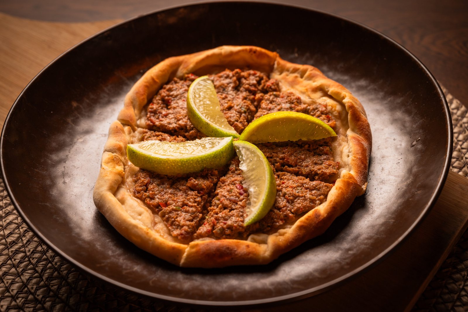 Pan árabe estilo Pizza libanesa cubierta con carne molida y especias. Sabor tradicional en cada bocado.